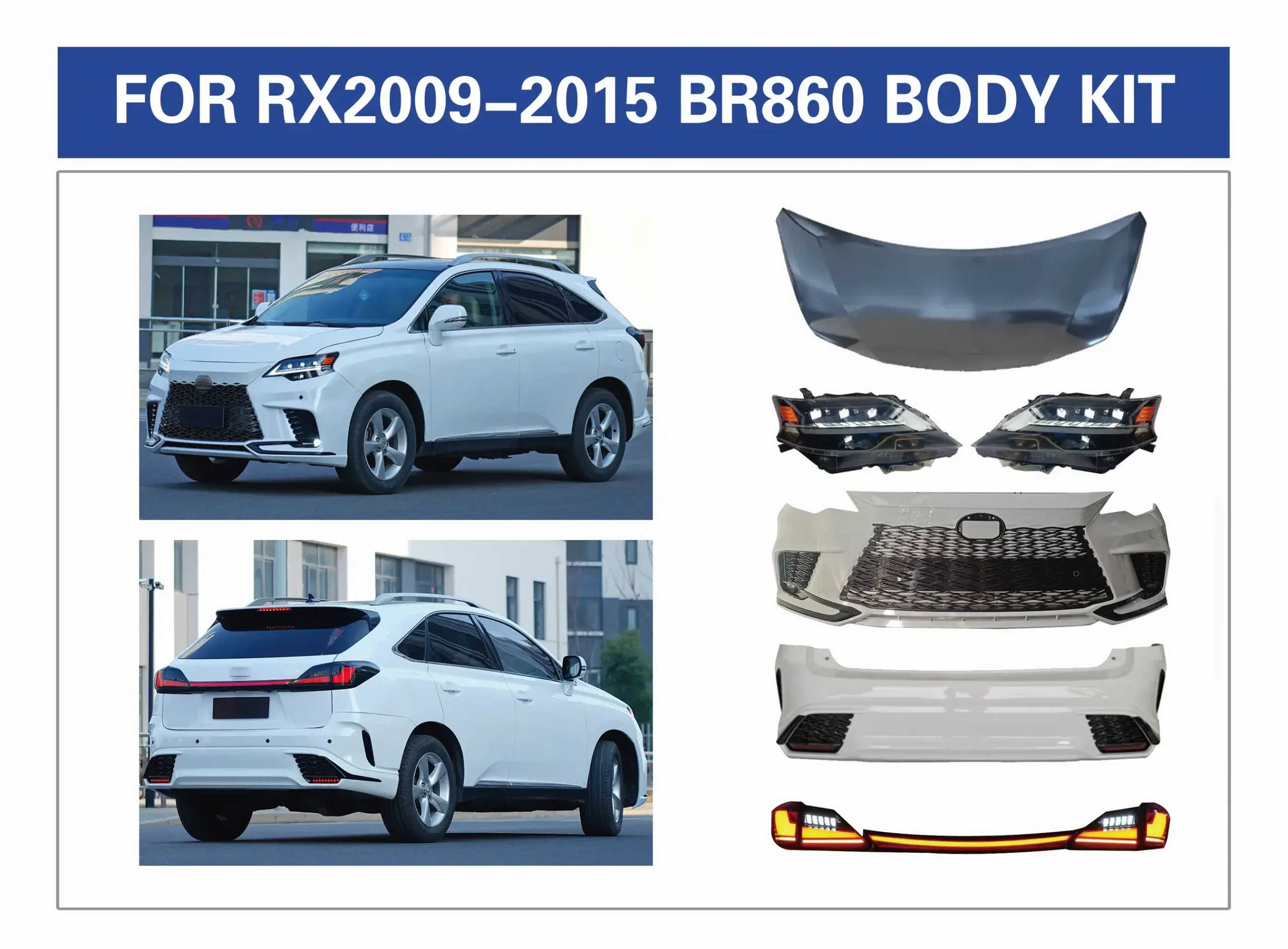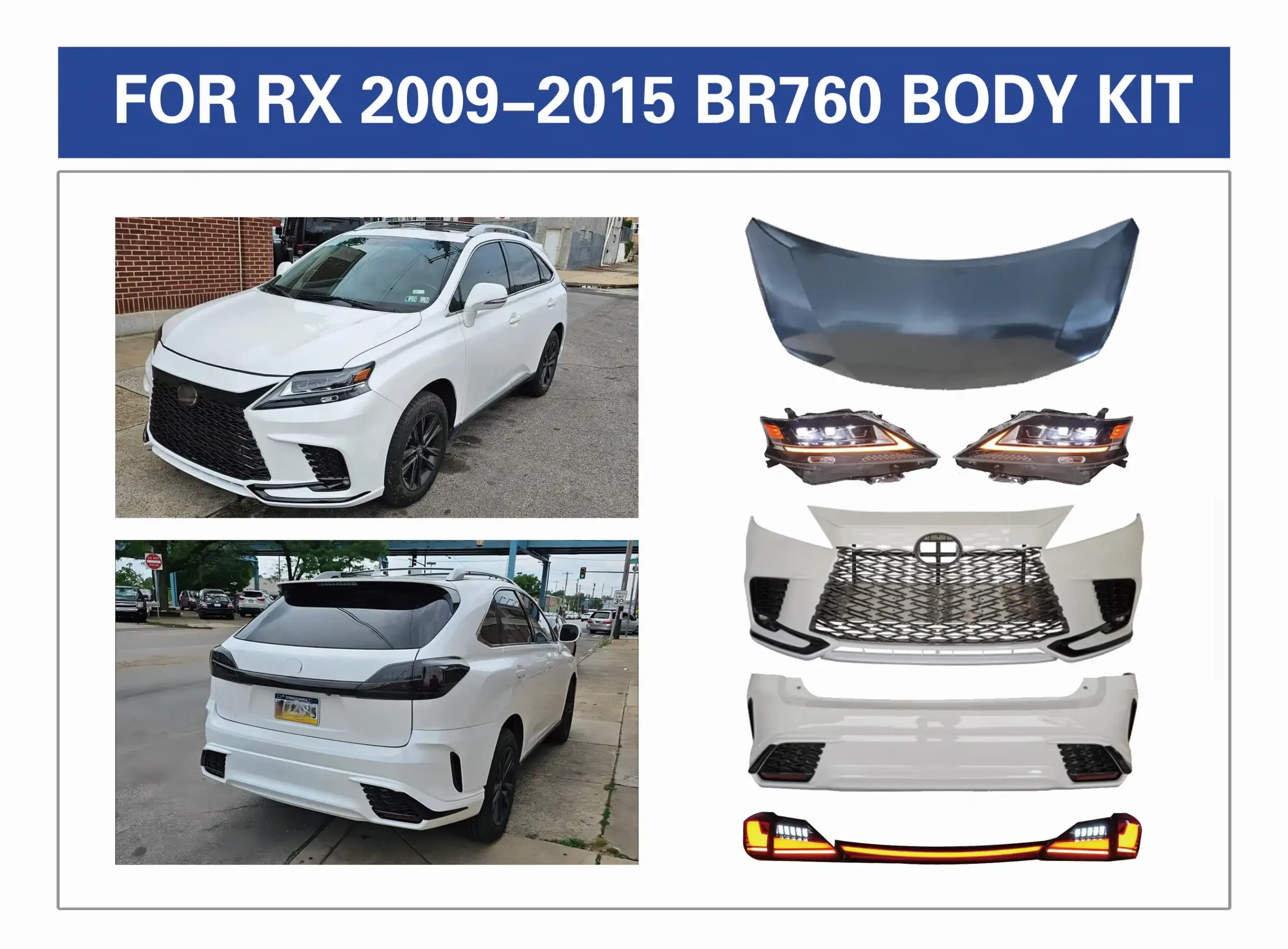 Revolutionize Your RX 2009-2015. Give your 2009-2015 model the head-turning, aggressive look of the latest 2023 style with our complete body kit conversion. It is including head lamp, tail lamp, hood, front and rear body kit. modern transformation.